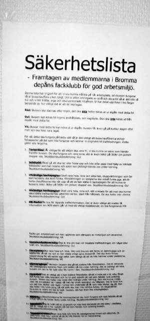 För några år sedan var frågan uppe på flera fackliga möten och tillslut enades man om att göra en enkät till alla förare på garaget. Efter ytterligare möten fick man fram en lista på 41 punkter, saker som förarna var eniga om skulle fungera på bussarna för att de skulle vara säkra att köra. Innan fordonen fick köra ut från depån kollade skyddsombudet om alla punkter på säkerhetslistan var uppfyllda. Första morgonen stoppades arton bussar.